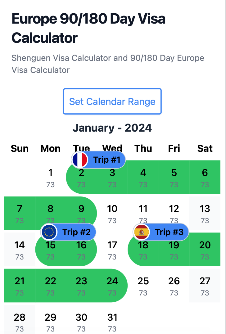 Calculate how many days you can stay in a Europe country with a 90/180 day Shenguen tourist visa